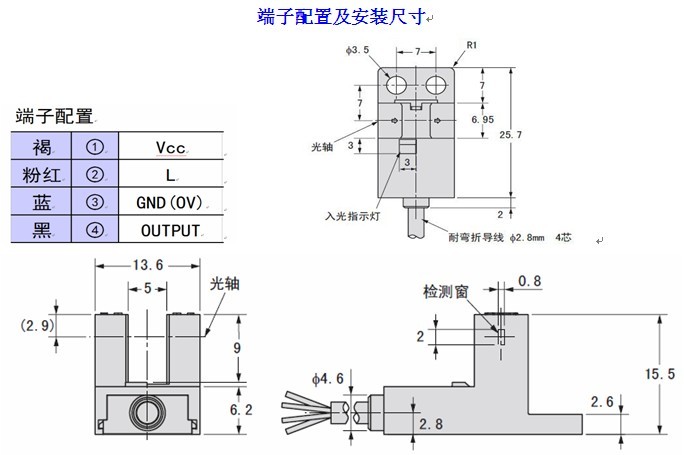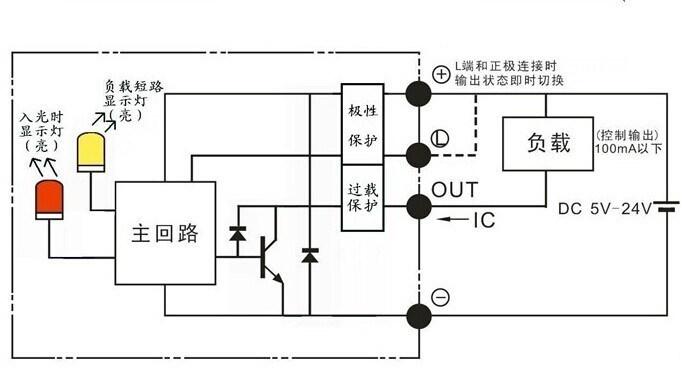 ● “L”引線與“+”引線相接時,輸出狀態(tài)即時轉(zhuǎn)換如:設(shè)傳感器現(xiàn)態(tài)為受光時指示燈亮、“out”沒有輸出電流,相接后指示燈仍亮、但“out”有輸出電流。其它各引腳接線錯誤時,傳感器不工作,但傳感器本身不會損壞;